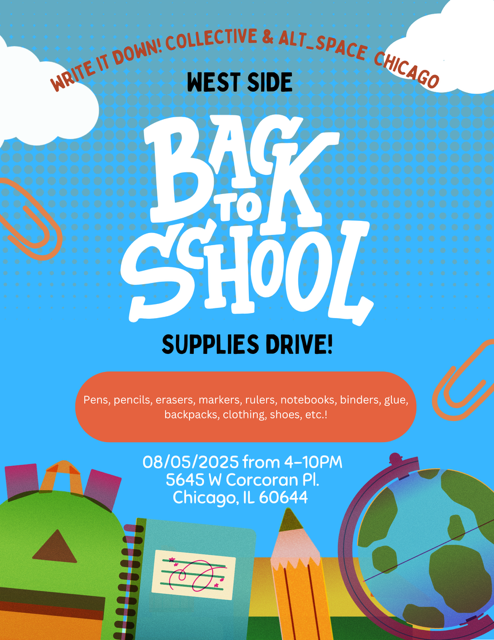 Write! It Down Collective Back to School Event Tuesday, August 5, 2025 4:00 PM 10:00 PM alt_ Chicago 5645 West Corcoran Place Chicago, IL, 60644 United States (map) Google Calendar ICS