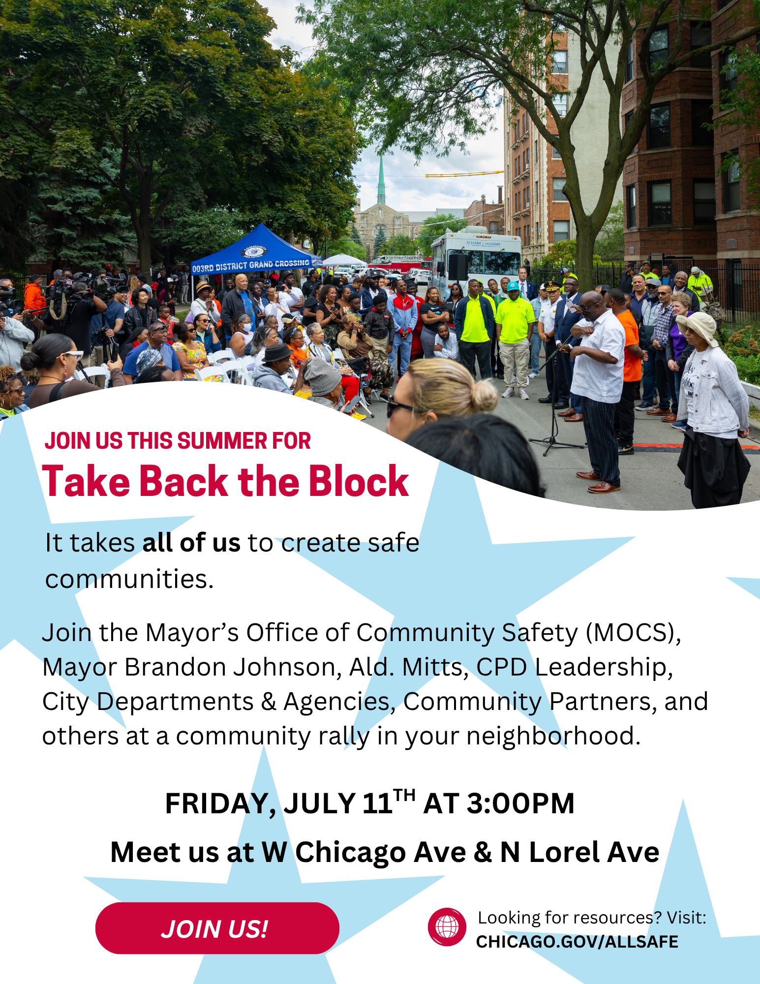Back to All Events Take Back the Block Friday, July 11, 2025 3:00 PM 5:00 PM W Chicago Ave + Lorel Ave United States (map) Google Calendar ICS